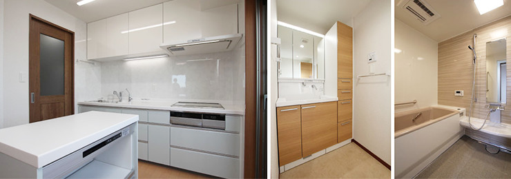 ▲ 左からキッチン(TOTO)、洗面化粧台(TOTO)、浴室(タカラスタンダード)