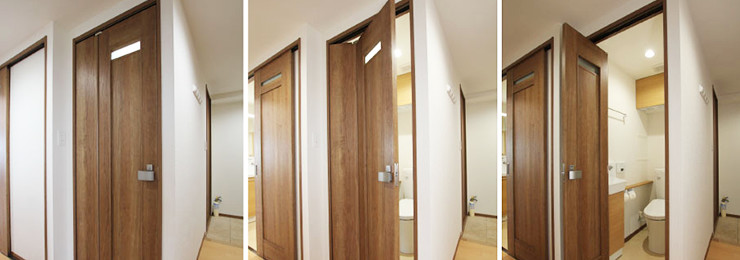 ▲ トイレ入り口の折戸を開けても、廊下を歩く人にぶつかることはありません - マンションの決まった作りの中でグランディアホームさんには最大限の知恵と技術を出してもらいましたね。