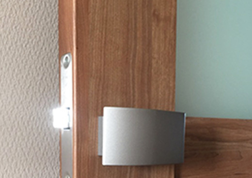 ▲ 平らなドアノブ - 本当に一変しました。 先程のトイレのドアの件もそうですし、ドアノブも通常のひねるタイプの物から平らな押すタイプのノブにしてもらったんです。 普通なら壁伝いに歩いていくとおなかにドアノブが当たってしまうんですが、これなら壁を伝って歩いていてもぶつからなくて安心です。