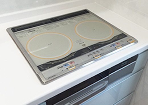 ▲ 音声案内付IHクッキングヒーター - キッチンのIHも、3口が一般的ですが、一番シンプルな2口にしたんです。2口の方が操作が少なくて簡単ですからね。音声での案内が付いている物を探しました。