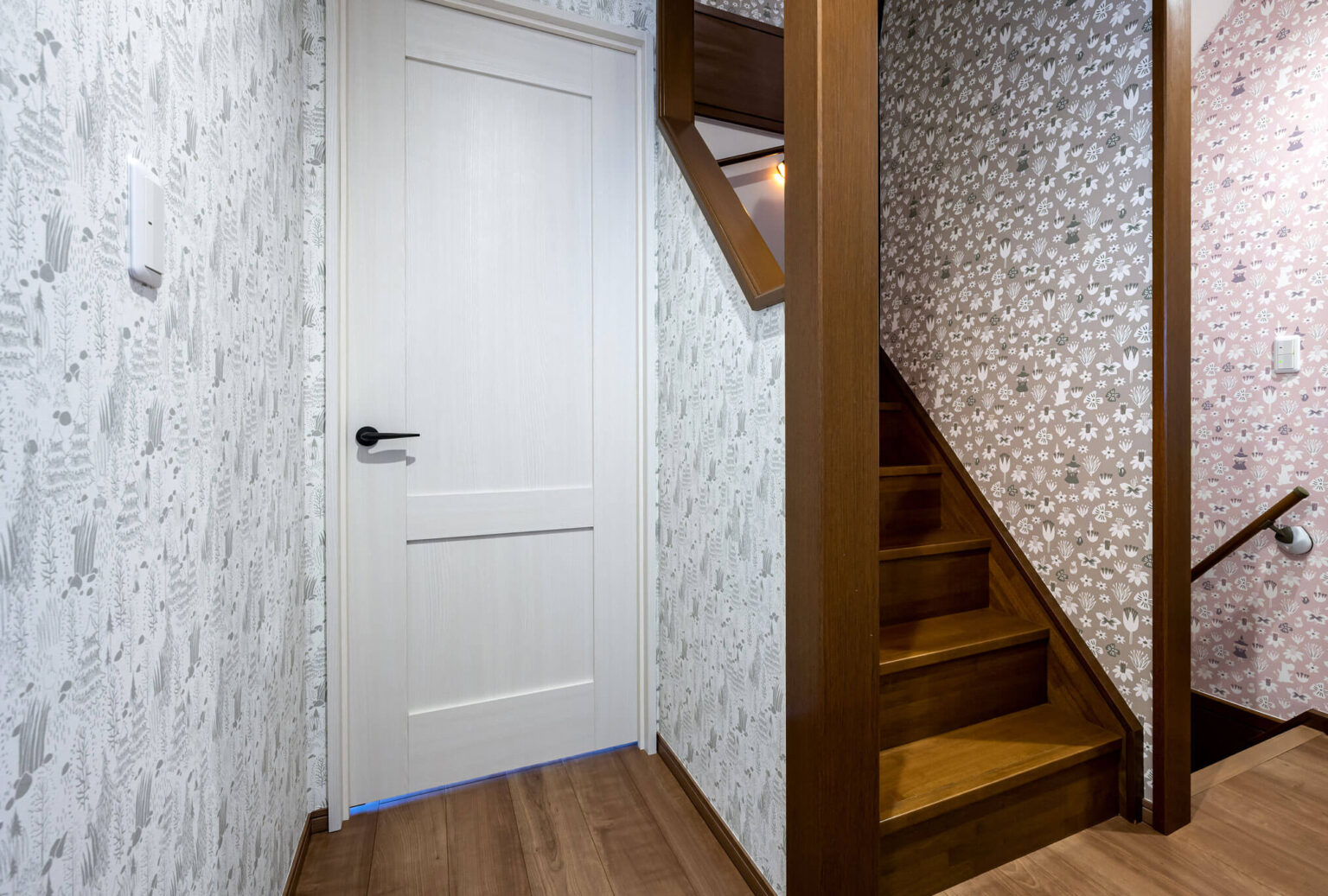 廊下と階段のクロスは奥さまの大好きなムーミン柄に張り替えました。楽しい気持ちで階段を行き来できるようになったとお喜びいただきました。